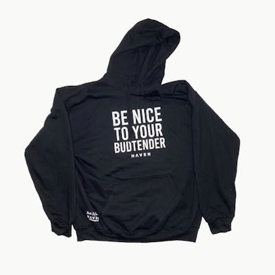 A classic black hoodie with a Haven exclusive Be Nice to Your Budtender design.