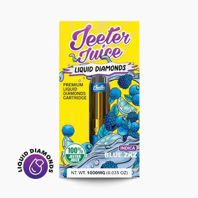 Blue ZKZ - IndicaBlue ZKZ is an indica cross of Blue Diamond and Zkittlez. This odoriferous flower offers a terpene profile of tart citrus, sweet earth, and wildflowers. The physical effects of this strain is mellow. Its strong physical effects and uplifting mental high make it a perfect end-of-the-day strain.Effects: Relaxed, UpliftedThe bold flavors, smooth pulls, and standout aromas you already know from our pre-rolls now in a 510 cartridge.* Made by melting nearly 100% THCa diamonds into a clean, potent oil.* No residual plant compounds, just smooth vapor and strong effects.* Paired with Jeeter's signature terpene profiles formulated by the industry's top flavor chemists.* Built for clean flavor and a hard-hitting experience that mirrors our infused prerolls.