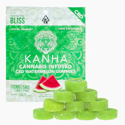 100mg CBD x 5mg THC per bag Kanha gummies are made with all-natural ingredients, coloring, and flavoring. Each gummy is infused with the highest quality cannabis oils to provide the most consistent, safe experience on the market. Our Watermelon 20:1 gummies are refreshingly juicy and made with 10mg CBD with just a hint of THC per gummy.