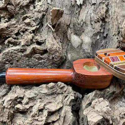 5" length laminated top pipe with a 9/16" diameter bowl and a pipe bit. The swivel top keeps the contents of the bowl inside the bowl. Available in Bocote from Mexico, Morado from Bolivia, or Padauk from Africa, and all have a laminated top made from a variety of exotic hardwoods and maple veneers. Extra bit included. All are handcrafted to the highest quality standards in central Pennsylvania, USA. ALL Sales are Final, Must be 21+ to purchase