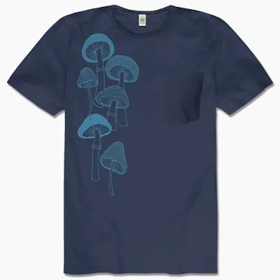 Awaken your soul through a magical journey with this Mushrooms Organic Pocket T-Shirt. Features a mushrooms print and front chest pocket on soft, organic cotton fabric. Only pure organic mushroom vibes here! Navy. Small - Chest: 34-36" Length: 27" Medium - Chest: 38-40" Length: 28" Large - Chest: 42-44" Length: 29" X-Large - Chest: 46-48" Length: 30" XX-Large - Chest: 50-52" Length: 31" 50% Organic Cotton, 50% Recycled Plastic OCS (Organic Content Standard) Certified Polyester is made from post-consumer plastic beverage bottles Made in the USA Knit fabric Fabric weight: 4.2 oz/sq yd Machine wash cold. Tumble dry low or line dry All sales are final