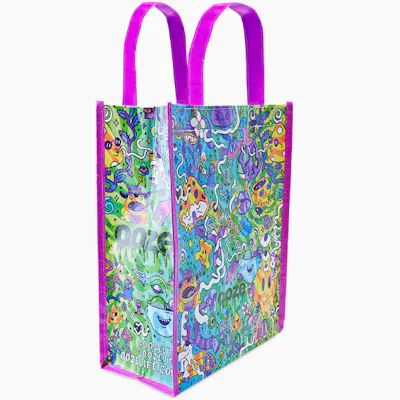 You'll stand out from the rest of the customers in line at the grocery store, that's for sure! The Chroma design gets funnier the longer you look at it. So many different icons and characters are floating around that you'll continue to notice new details. Pack your towel, sunglasses, smoking supplies, and snacks in the Ooze Reusable Bag and head to the beach, a friend's house, or just out and about for the day. Tell everyone you live the Ooze Life without telling everyone you live the Ooze Life just by carrying around this colorful, Oozey bag! Save the planet one plastic bag at a time! The Ooze reusable bag is a durable grocery bag with two sturdy handles attached in the center. We redesign this classic bag each and every year, which means this year’s Chroma design will only be available in 2023. Features *CHROMA | Discover all the fun, wacky characters floating in the world of Chroma! The bright colors really stand out, and the borders and handles are vibrant purple. *SMALL | This is the smaller version of the Ooze Reusable Bag. It's roughly the size of a Lululemon bag or lunch bag. *REUSABLE BAG | The Ooze Reusable Bag can be used again and again! Stop using single-use plastic bags and choose a much more sustainable option. It's simple swaps like this that make the difference long term. *LIMITED EDITION | Ooze redesigns the reusable bag every year, and the 2023 design is Chroma! This will only be available this year, making the Chroma bag a collector's item. *USES | The Reusable Bag can be used again and again. Take it to the grocery store, to the beach, to a party, or to the smoke session. Bring it with you anywhere you need to take a few belongings. ALL SALES ARE FINAL