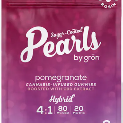 80mg CBD/20mg THC 2pk Description Cozy up and wind down with sweet and refreshing Pomegranate Pearls. Infused with CBD and THC in a 4:1 ratio, these Pearls will take you to a completely elevated state of delight.