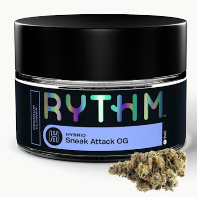 RYTHM Premium Flower offers a variety of expertly cultivated and meticulously cured strains with optimal potencies, lush aromas, and rich flavors. | Fully living up to its name, Sneak Attack OG is a true creeper. This stealthy hybrid is known for a slow yet steady build up, ultimately delivering a perfectly balanced experience culminating in mellow, full-bodied relaxation. With sweet, earthy and gassy aromas handed down from her proud OG lineage and a deliciously creamy flavor profile reminiscent of parent Cream Cookiez, she’s a smooth-smoking strain equally gifted from both sides of her heritage. As for those dense, trichome-glazed, sticky-on-the-breakup nugs, they showcase an inherited bag appeal as fine as the nose and taste. Explore your taste in premium cannabis with RYTHM's curated lineup of expertly cultivated, award-winning strains. Strain type: Hybrid Potential effects: Unwinding, promotes general relaxation, relieving stress Lineage: Cream Cookiez x Dual OG Dominant flavors: Sweet, creamy