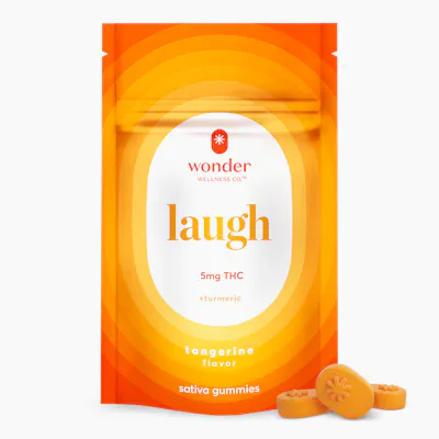 A gummy with just enough cheer. Each laugh gummy has 5mg of sativa THC to keep you in high spirits. Enhanced with turmeric which is shown to have strong anti-inflammatory and antioxidant properties leading to improved mood. An energizingly sweet bright and zesty tangerine flavor that's vegan-certified gluten-free and has no artificial preservatives sweeteners flavors or colors. Great for your first time or building the ideal high. • 5mg THC per gummy • 20 gummies per package • 100mg THC per package