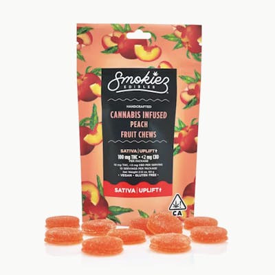 Enhanced with real cannabis terpenes! Smokiez Peach Sativa Fruit Chews are NOT YOUR AVERAGE FRUIT CHEWS™ ;) These fruit chews taste like fresh peaches picked right off the tree, with a balance of sweetness and fruity notes. These delicious fruit chews are a tasty and discreet way for you to medicate! They are also Vegan, Gluten Free, Dairy-Free, and contain NO High Fructose Corn Syrup. Each of our mouth watering fruit chews contain 10 mg of THC, and made with our high clarity cannabis distillate for great taste. There are 10 pieces per package with 100 mg active THC per package.