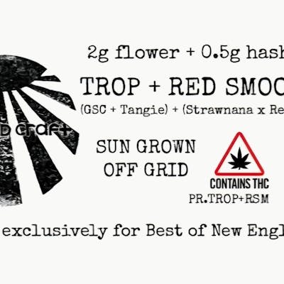 2g Trop flower (GSC x Tangie) + .5g Red Smoothie hash (Strawnana x Red Piegasm) Available ONLY at Herbal Remedies