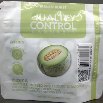 Wind down with flavor and potency in perfect harmony. Quality Control – Melon Burst Liquid Diamond Gummies offer a mouthwatering way to experience the calming effects of premium indica cannabis. Each 10-pack contains 100mg of THC infused with liquid diamonds, delivering a fast-acting and full-bodied edible experience.