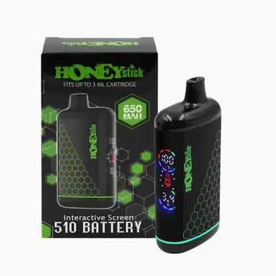 Step into the future of cartridge vaping with the HoneyStick Interactive 510 Battery—a sleek, buttonless pen-style vape designed for smooth performance and total control. Featuring a high-resolution interactive screen, variable voltage settings, and a 15-second preheat function, this autodraw battery combines innovation and simplicity in one compact, discreet device. Specifications: Fits most 510 thread cartridges (up to 16mm wide, 58mm tall, and 3ml capacity) Draw-activated (no buttons needed for use) Interactive Hi-Res screen displays voltage, battery life, and usage status Three voltage settings: 2.8V (green) 3.4V (blue) 3.8V (red) 15-second preheat function (1.8V) with animated rocket icon High-capacity 650mAh battery with USB-C rapid charging (cable not included) Compact, discreet design with concealed cartridge chamber Compatible with bottom airflow 510 cartridges only The HoneyStick Interactive Cart Pen delivers a next-level vaping experience—perfect for users seeking advanced control, sleek style, and total discretion.