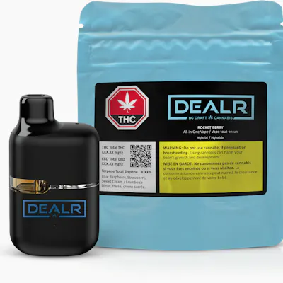Lift off with Rocket Berry, the hybrid all-in-one built for those who like to keep discreet. Crafted from Blueberry Cookies x Cherry OG, it layers blue raspberry and strawberry over sweet cream for a smooth, light finish. Each device is filled with a blend of liquid diamonds, flavourless cured resin, and terpenes. The formulation centres on liquid diamonds as the majority component, supported by a smaller portion of flavourless cured resin, with the remaining fraction dedicated to terpenes, which naturally vary by batch. Together, they deliver smooth, consistent vapour with no additives, carriers, or harsh aftertaste. Conveniently rechargeable with a USB-C port, DEALR vapes are built for clean flavour, discretion, and on-the-go ease.