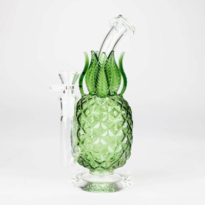 This pineapple-shaped glass bong is a tropical-inspired piece that combines fun design with functionality. Its detailed texture and green leaf accents make it a charming addition to any collection. Perfect for those who love unique and vibrant smoking accessories. Height: 10" Thickness: 5mm Thick bowl for 14 mm female joint Weight: 580g
