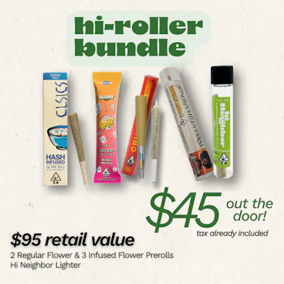 $95 retail value. *Specific Items chosen in-store only 2 Regular Flower & 3 Infused Flower Prerolls Hi Neighbor Lighter
