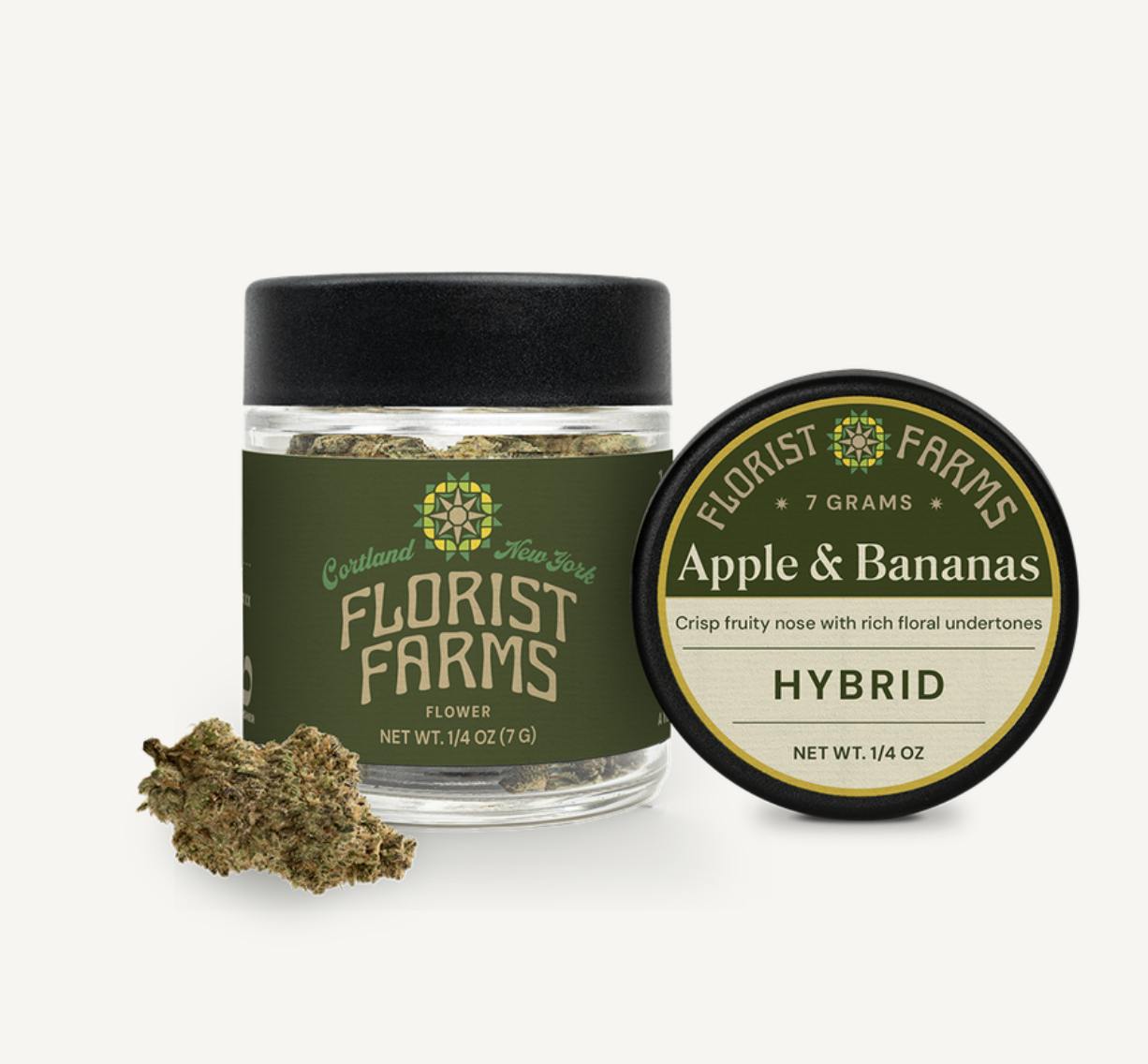 Apple & Bananas | Hybrid | QuarterAbout This ProductThis quarter-ounce of Florist Farms flower is hand-trimmed, sustainably grown in living soil, and cultivated with care in Cortland, NY. Whether you're rolling up or packing a bowl, expect a smooth, consistent experience rooted in craftsmanship and integrity.Effect: HybridFlavor: Crisp fruity nose with rich floral undertonesIngredients: 7 Grams of Cannabis FlowerWhy We Love Florist FarmsLocated in Cortland, NY, Florist Farms is committed to sustainability. They practice regenerative farming by growing in living soil, using organic compost, and never using pesticides. For over a decade, they have been organic vegetable farmers and donate produce weekly to help support their community. Our friends at Florist Farms are deeply committed to quality and to delivering the cleanest cannabis products in New York State.Sustainably Grown • Lab Tested • No Artificial Flavoring • No Pesticides • Non-GMO