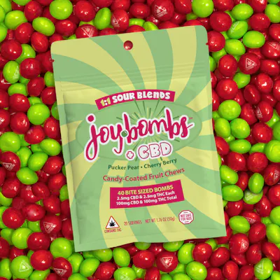"Treat yourself to deliciously sweet and sour flavors in a perfect blend of 1:1 CBD and THC with Sour Blends Joy Bombs + CBD! Every pouch includes a mix of two sour-soaked flavors: Pucker Pear and Cherry Berry! Joy Bombs Candy-Coated Fruit Chews are purposefully dosed to help you dial in or stack the milligrams and effects that you want – but good luck trying to eat just one! With 2.5mg CBD and 2.5mg THC in each bite-sized piece of Sour Blends, you can micro-dose for days or nom the whole pouch for a 100mg THC adventure! Perfect for sharing, Joy Bombs’ signature sugary shell means they'll melt in your mind, but not in your car or pocket. They’re the UNGUMMY you’ve been waiting for!"