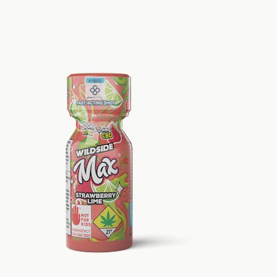 Wildside MAX Strawberry Lime delivers a 100mg THC shot with a crisp citrus kick and a hint of berry sweetness, no filler, no fluff. Just 100mg THC + 5mg CBD packed into a 2oz THC shot designed to go wherever you go.Backed by our Elevate profile, this shot supports clarity and calm when you need to reset or wind down. Thanks to our Ultrasonic Nano Emulsification Technology (UNET), it works quickly. Effects hit in about 10 minutes, so you're not left waiting around.PotencyPer Bottle: 100mg THC + 5mg CBDTerpenesMyrcene, Terpinolene, ß-Caryophyllene, Limonene, ß-Pinene