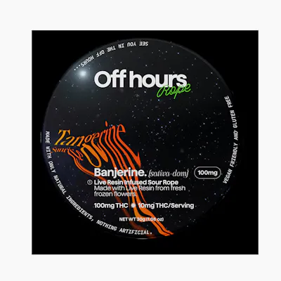 Banjerine Live Resin Infused Rope Flavor: Tangerine Sunrise (sour) Size: 1ct Strength: 100mg THC (10mg/serving) Species/Type: Sativa-dominant hybrid Lineage: Banjo x Cotton Candy Effect: Happy, Energized, Creative Flavor: Yuzu Tangerine with a splash of Pineapple Pairs well with: Exercising, Socializing Suggested use: Start with 1/2 of a section. Wait 1 full hour before increasing dose. Ingredients: organic cane sugar, reverse osmosis water, organic tapioca syrup, organic fruit juice from concentrate, fruit pectin, organic fruit flavoring, natural food coloring, MCT oil, cannabis extract, soy extract, terpenes, malic acid Alt description: Off Hours sour Tangerine Sunrise ropes are infused with Banjerine Live Resin for an energizing, social high. Each rope is naturally flavored with yuzu, tangerine, and a splash of pineapple to complement citrusy Bangerine.