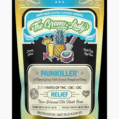 Escape to an island of relief with our *Painkiller Gummies, expertly crafted to deliver deep relief, reduce inflammation, and elevate your mood. Infused with a powerful blend of 10mg THC, 5mg CBC, and 5mg CBG per gummy. These fast-acting, vegan gummies provide profound pain relief while CBC interacts with serotonin receptors, offering potential antidepressant and anti-anxiety effects. Let your senses drift away with the tropical fusion of juicy pineapple, creamy coconut, and bright citrusy orange—a flavor combination that transports you to your own personal paradise with every bite. Fast-acting and Vegan. 10 servings, 10mg THC / 5mg CBC / 5mg CBG per piece