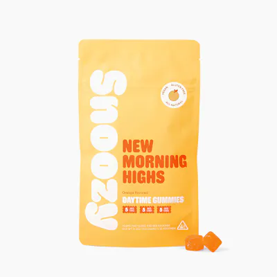 Waking up is hard sometimes. Find inspiration with Snoozy New Morning Highs Gummies. New Morning Highs help you greet the day with a calm, euphoric, uplifted mind, putting a pep in your step that will last well into the day. Each gummy contains cannabinoids THC, CBD and CBG. Formulated with all-natural & gluten- free ingredients to help you seize the day. ALL-NATURAL | VEGAN | GLUTEN-FREE Servings per Package: 20 Gummies Serving Size: 1 Gummy Active Ingredients: Per Package: THC: 100MG CBD: 100MG CBG: 100MG Per Gummy: THC: 5MG CBD: 5MG CBG: 5MG Ingredients: Sugar, organic tapioca syrup, reverse osmosis water, fruit pectin, organic orange concentrate, natural flavoring, natural food coloring, cannabis extract, citric acid, sodium citrate, sunflower lecithin This product is manufactured in a facility that uses tree nuts.