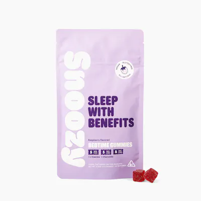 Nighthawks and early birds have one thing in common - good and consistent rest is important to overall health. Snoozy THC Gummies for Sleep help you get the rest you need when you can’t sleep. Each Snoozy gummy contains cannabinoids such as Delta 9 THC, CBD, and CBN, combined with all-natural chamomile and L-theanine to promote restful sleep. Formulated with Organic & All Natural ingredients to help you get the rest you deserve. ALL-NATURAL | VEGAN | GLUTEN-FREE Servings per Package: 20 Gummies Serving Size: 1 Gummy Active Ingredients: Per Package: THC: 100MG CBD: 100MG CBN: 100MG Chamomile: 200mg L-theanine: 500mg Per Gummy THC: 5MG CBD: 5MG CBN: 5MG Chamomile: 10mg L-theanine: 25mg Ingredients: Sugar, organic tapioca syrup, reverse osmosis water, fruit pectin, organic raspberry concentrate, natural flavoring, natural food coloring, cannabis extract, l-theanine, chamomile, citric acid, sodium citrate, sunflower lecithin This product is manufactured in a facility that uses tree nuts.