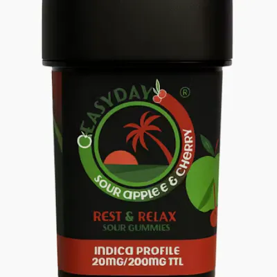 Sour Apple Cherry Rest and Relax Gummies by Easy Day are indica formulated edibles crafted to help you slow down and settle in. The flavor delivers a bright sour apple kick layered with sweet cherry richness and a smooth candy finish.