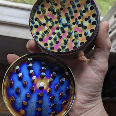 4-Piece 'Rainbow' Metal Grinder, 100mm Dimensions: 4-inches (Diameter) x 2.25-inches (Height) A durable Zinc-Aluminum 4-Piece 100mm Iridescent Rainbow Grinder that will last a lifetime! Equipped with easy to operate hand grip design and sharp diamond-shaped teeth to gnash through your bud with great ease to ensure smooth, wear-free grinding. Includes a Mini Guitar Pick Shovel.