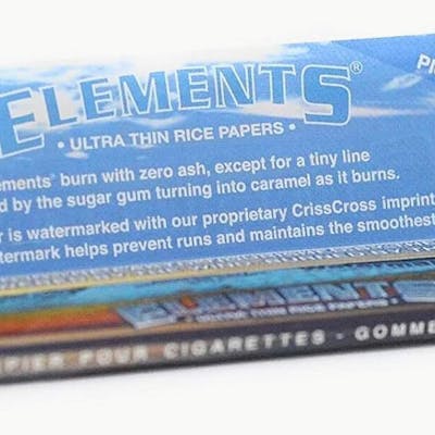 Elements Ultra Thin King Size Slim Rice Papers 32 Leaves per Pack Elements burn with almost zero ash, except for a tiny line caused by the sugar gum caramelizing as it burns. Each paper is watermarked with their proprietary CrissCross imprint. This special watermark helps prevent runs and maintains the smoothest burn. Grown in the Earth, Nourished by the Water, Powered by the Wind, Burned by the Fire. Made in Spain