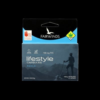 Fairwinds Lifestyle Indica Capsules, 10-Pack 10 Capsules per package with 10mg THC per Capsule Designed to accentuate an easygoing lifestyle! Formulated with all-natural ingredients, fortified cannabis terpenes, and premium-flower-extracted cannabis oil. These capsules are a shelf above the rest. Ingredients: Indica Cannabis Oil w/standardized terpenes, herbal extract blend (theanine, passion flower, valerian root), and coconut flakes. Proprietary terpene blend of Myrcene, Linalool and Caryophyllene