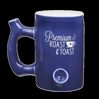 Roast & Toast Pipe Mug Capacity: 11 Liquid Ounces Roast and Toast mugs make trendy gifts for fun loving adults. If your friends don't yet have one - now is the time to offer some as presents! This single-wall mug is made from ceramic and features a standard coffee cup that can hold approximately 11 oz of your favorite blend. Attached to the front of the mug is a pipe where you can pack your cannabis and light it. The smoke filters up the hollow handle to the mouthpiece on the top. The mug comes in a beautiful blue color with a white inside and a striking white imprint on the front. It is microwave and dishwasher safe. Sit back, relax and enjoy a smoke and coffee with like-minded friends.