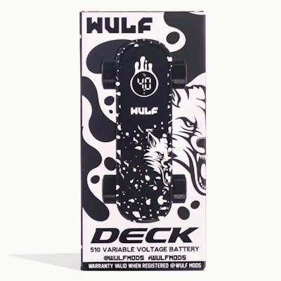 Wulf Skateboard 510-Cartridge Battery (Black-White Splatter) Temperature Control: 2.8v, 3.2v, 3.6v & 4.0v Hit the Deck! We’ve all heard of kick flips, but what about cart-flips? Well the future is now because the Wulf Mods Deck Voltage Battery is ready to drop in! The Deck pulls double time as a finger skateboard, complete with highlights like functioning grip tape, and as a fiery 510 threaded cartridge battery. This lets you hit tricks and your cartridge with the same device, making for the world’s first skateboard-vaporizer!!! Take a couple of rips before messing around with your Deck for some mini skate tricks and see if you can land the newly dubbed “Blinker-Kick-Flip” or use your creativity to make up your own cloud-centric combos! Cartridge Not Included