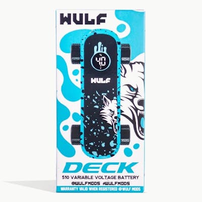 Wulf Skateboard 510-Cartridge Battery (Blue-Black Splatter) Temperature Control: 2.8v, 3.2v, 3.6v & 4.0v Hit the Deck! We’ve all heard of kick flips, but what about cart-flips? Well the future is now because the Wulf Mods Deck Voltage Battery is ready to drop in! The Deck pulls double time as a finger skateboard, complete with highlights like functioning grip tape, and as a fiery 510 threaded cartridge battery. This lets you hit tricks and your cartridge with the same device, making for the world’s first skateboard-vaporizer!!! Take a couple of rips before messing around with your Deck for some mini skate tricks and see if you can land the newly dubbed “Blinker-Kick-Flip” or use your creativity to make up your own cloud-centric combos! Cartridge Not Included