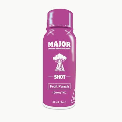 2oz Fruit Punch Fast Acting THC Shot MAJOR is powered by SōRSE, a proprietary fast-acting water-soluble emulsion technology that makes consuming cannabis easier, safer, and more fun! MAJOR packs a punch in 8-15 minutes. Throw it all back at once or micro-dose and make it last!