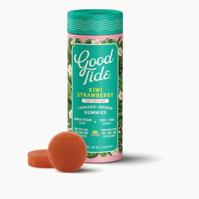 Lean into relaxation and recovery with Good Tide Kiwi Strawberry THC:CBD:CBG gummies. Hybrid single-strain rosin along with an extra boost of CBG are wrapped up with juicy kiwi strawberry flavors to help you fully reset.? 20mg THC / 10mg CBD:CBG per gummy, 200mg THC: 100mg CBD: 100mg CBG per container.