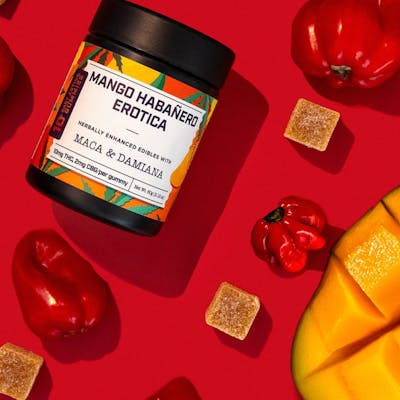 The Mango Habañero Erotica fast acting gummy is made with organic ingredients and flavored with real mango juice and spiced with real habanero peppers. Enhanced with organic herbs of maca & damiana and an added minor cannabinoid of 2mg of CBG for extra erotic boost to bring your night to the next level.