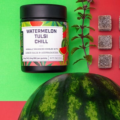 The Watermelon Tulsi Chill fast acting gummy is made with organic ingredients and flavored with real watermelon juice and real tulsi extract. Enhanced with organic herbs of lemon & ashwagandha and an added minor cannabinoid of 2mg of CBC for the ultimate chill experience.