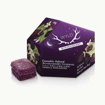 Hit the snooze button. Boysenberry THC:CBD:CBN gummies are perfect for deep sleep. CBD helps the body relax, while CBN can provide a restorative rest for the mind. When combined with THC, Wyld's Boysenberry gummy activates the Entourage Effect to set the landscape for a relaxing, restorative sleep. -- 1:1:1 THC:CBD:CBN | Perfect for deep sleep. -- Made with Linalool, Myrcene, Beta-Caryophyllene + Terpineol.