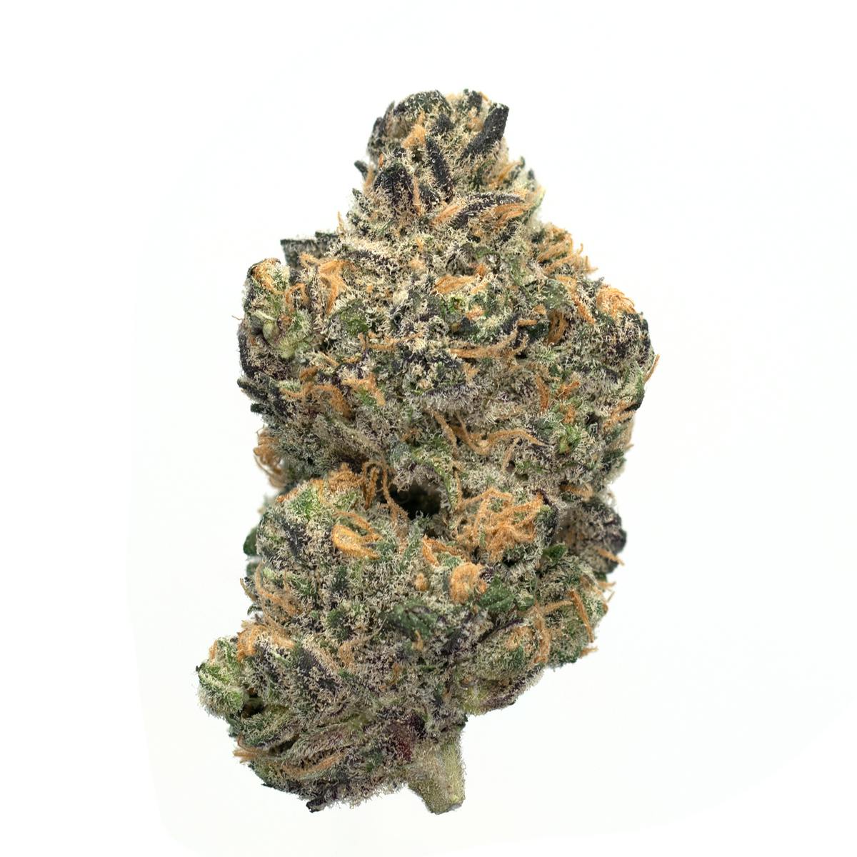 Blue Zushi is a slightly indica dominant hybrid strain (60% indica/40% sativa) created through crossing the delicious Zkittlez X Kush Mints strains. Known for its gorgeous appearance and pretty well balanced high, Blue Zushi is perfect for any indica lover. This bud has small and fluffy rounded forest green nugs with deep blue undertones, vivid orange hairs and a thick frosty coating of gorgeous tiny blue-tinted white crystal trichomes. As you pull apart each sparkling little nugget, aromas of spicy flowers and rich earthy pine are released, almost like walking through a forest after a rainstorm. The flavor is of sweet earth and spicy flowers with a mellow herbal tea-like taste that lingers on the tongue. The Blue Zushi high comes on with a slow sneaking creep, sneaking into you before launching you into a lifted and energized state. You'll feel a budding euphoria accompanied by a tingly buzzy body high that quickly makes your energy level u-turn into deep relaxation and ease.
