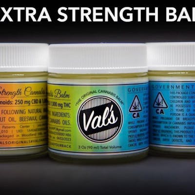 Val's Extra Strength Balm comes in 1000mg THC. This balm contains 1000mg of THC, with 250mg of CBD per container.