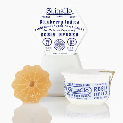 Enjoy Spinello! Served in a stay fresh case, our delicious Blueberry Indica fruit chews are infused with premium live rosin in an easy dose, break-away gummy. Vegan, gluten free, and made with all natural flavors, each fruit chew contains 10mg THC per serving, with 100mg THC total per package. ENJOY TODAY.