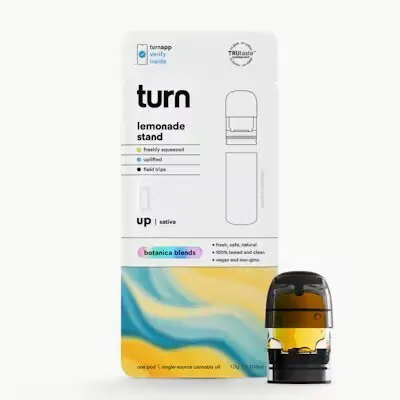 Fresh squeezed! If a lemon drop and the Sun had a baby, this would be it. Perfect for goal-crushing or an extra nudge out of bed, this sativa-forward strain could be just what you need to get into a blissful state of focused euphoria with a chill effect as it tapers off. freshly squeezed - uplifted - field trips turn botanica blends You'll only get clean, fresh, guaranteed pure California goodness from seed to pen. Choose from a wide selection of our high potency, exclusive, hand-curated botanica blend formulations to get the perfect floaty feeling you're looking for. // oil highlights // Single source California fresh grown Tested and verified clean Vegan, non-GMO, ultra pure Natural botanical terpenes turn pods are crafted with care + maximum intention What’s worse than incredible oil ruined by a pen that’s too hot or not hot enough? Paying $$ for it. We engineered turn pods to treat your oil like the VIP it is. Precise heating tech treats various viscosities. No buttons, no guesswork, no user error. Perfectly calibrated design for free and easy airflow. Pods CBD 1.84mg