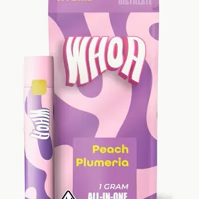 The WHOA Vape AIO (All-In-One) 1.0g Hybrid Peach Plumeria is a cannabis vape product featuring a hybrid strain profile designed for both flavor and effect.