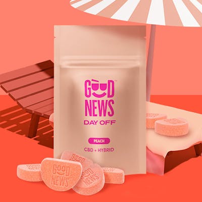 Made with LIVE SAND Concentrate 1:1 THC/CBD | 5mg THC/ea – 5mg CBD/ea | 100mg THC Total – 100mg CBD Total | 200mg TAC Total Put your world on pause with DAY OFF Good News Gummies!