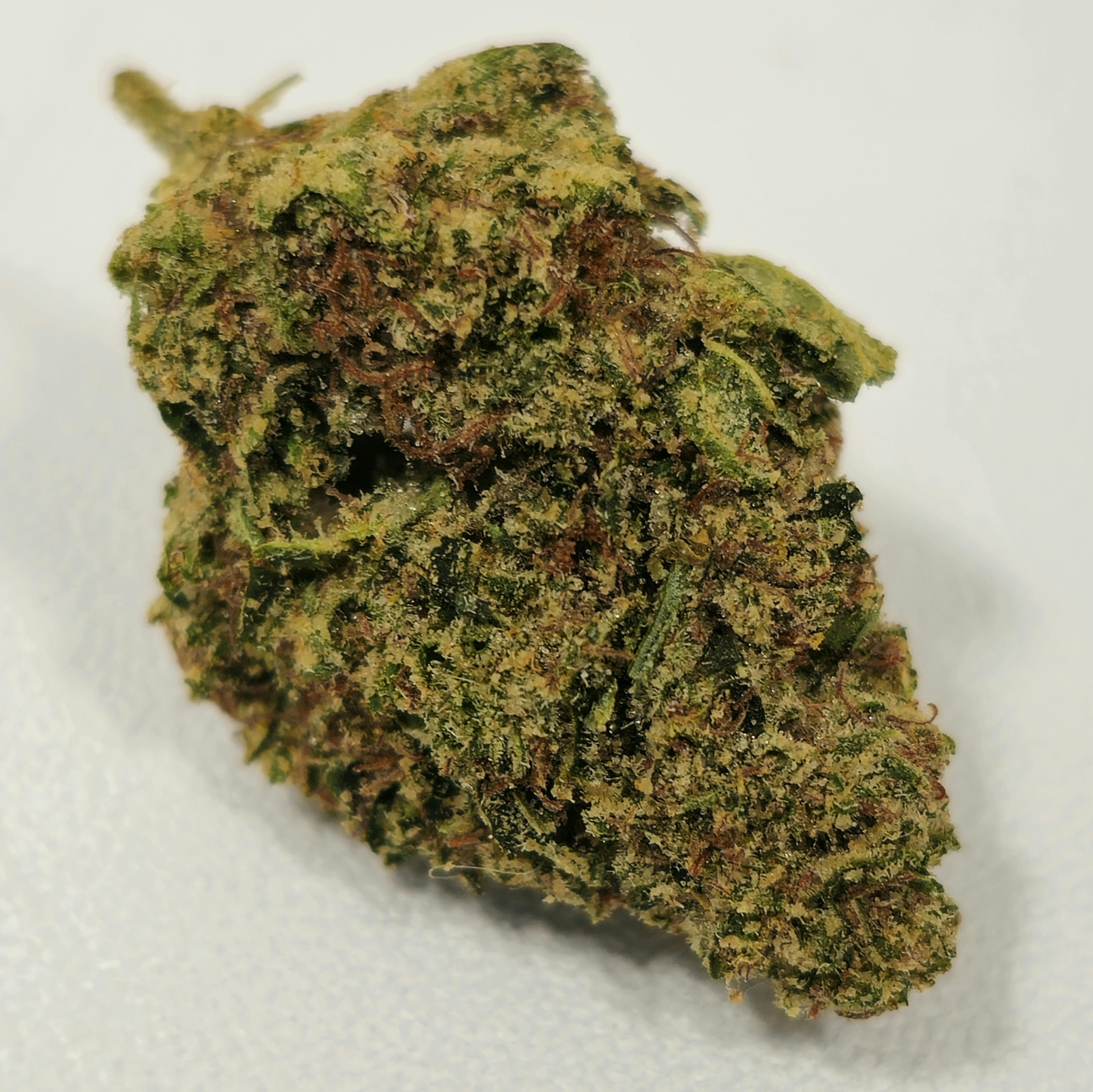 Divine Genetics also has a strain that’s a cross of Chemdawg #4 and GSC that it calls Chem Cookies. Despite the similar genetics, it appears to be a different strain with different phenotypes for both parents, although it’s worth noting that some people do confuse two strains. GMO Cookies is said to produce olive green buds with bits of purple and orange blanketed by a mantle of trichomes.