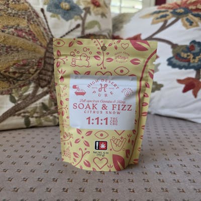 High Desert Pure's Soak and Fizz is a delightful addition to your self care routine. Containing a full-spectrum blend of THC, CBD, and CBG, epsom salts, a fizzy bath bomb base, and their signature citrus snow scent, this soak is quite the treat. The single-use packet contains 150mg of cannabinoids, and is a great way to test out this bath formula before committing to a full bottle! Be prepared for full-body relaxation after your bath, this soak and fizz is a delightful and soothing addition to your self care routine! As an added bonus, this formula is dye-free. vegan and cruelty free, as well as sustainably packaged! Scent Profile: Lightly scented with citrus essential oils for a rejuvenating & relaxing soak. Key Ingredients: Epsom salts, bath bomb blend. Suggested Use: Add full packet into a warm bath, soak, and relax. Pairs perfectly with your favorite relaxing music, other soaking herbs, and even more epsom salt for added relief. Complete this experience by applying High Desert Pure topicals after you soak!