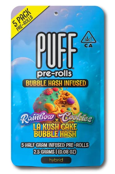 PUFF Bubble Hash pack - Pre Roll 5 Pack - 2.5g - Hybrid--Rolled with Premium Rainbow Cookies Flower and LA Kush Cake Bubble Hash--Rainbow Cookies crossed with LA Kush Cake. This unique fusion blends the sweet and fruity notes of Rainbow Cookies with the earthy and decadent flavors of LA Kush Cake. The result is a harmonious symphony of tastes that tantalizes the taste buds.--49.70% THC