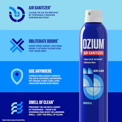 OZIUM® Air Sanitizer attacks and temporarily reduces airborne bacteria*, fighting its spread. A trusted brand for over 50 years, OZIUM® is clinically proven to sanitize and freshen the air in homes, offices, cars and other small spaces. OZIUM® Cleans the Air You Breathe® and eliminates unpleasant odors.