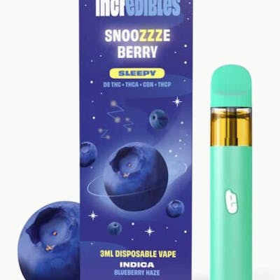Sleepy. Drift into a tranquil slumber with Snoozzzeberry, a soothing blend of Blueberry Haze and the comforting essence of blueberries. Infused with a mix of D8 THC, THCA, CBN, and the unique THCP cannabinoid, this disposable vape is your ticket to a restful night, promising a sleepy embrace that gently guides you into dreamland. Recognized with multiple Cannabis Cup awards, Snoozzzeberry stands as a testament to its exceptional quality, delivering a peacefully laid-back experience that truly sets it apart. Perfect for getting rocked to sleep.