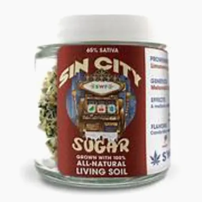 Sweetwater Farms Sin City Sugar Genetics: : Melonaid x (Biscotti x Froyo) - 65% Sativa.Effects: A mellow Sativa Buzz that hits just right.Flavors: Candy like essence with a velvety mouth feel.Suggested Activity: Massage TimeSweetwater Cannabis Flower: This brand cultivates cannabis indoors using living soil and organic compost tea blends to enhance plant health and terpene expression. Their controlled environment ensures superior quality, producing flower with exceptionally bold and vibrant terpene profiles.