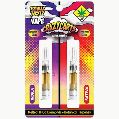 dope cooks 2pk Grape/sour Batch Kids Crazy CartThe Chef has gone crazy! He's added tasty botanical terpenes to his purely potent Melted Diamonds to create these premium Cannabis Vape Carts. Melted Diamonds are made by growing pure THCa crystals and then melting them into pure THC oil. You can expect a potent, flavorful, and discreet experience when you fire up a Crazy Cart! | Pesticide Free | Distillate Free | Big Flavor | Discreet Aroma | Super High Potency.Extraction Solvent: Close Loop BHOCartridge: CCell M6T-SE - Low lead Brass Center Post, BPA-Free Thermoplastic Tank, CCell Standard Ceramic Heating Element.