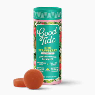Good Tide Kiwi Strawberry 1:1:1 CBD/CBG strain & genetic info: Gary PaytonBursting with tropical goodness, Good Tide gummies transport you to a place where the sun is always shining. Made with real fruit ingredients and full spectrum solventless hash rosin which is full of naturally occurring terpenes and minor cannabinoids, our carefully crafted formulations create a perfect combination of flavor, aroma, and effect. While Good Tide is a fan of breaking the rules, there happen to be three that we have for ourselves: Have fun. Do good. Make waves.Per Package: 100 THC, 100 CBD, 100 CBGPer piece: 10 THC, 10 CBD, 10 CBG