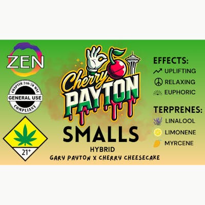 Zen Cherry Payton Genetics & Strain Info: Gary Payton x Cherry CheesecakeBaby Buds: Premium Indoor Flower Small Batch Craft Cannabis Always Hand Trimmed with Care. Same great flower just smaller budsClean Weed Practices: Zen prioritizes purity and quality, focusing on pesticide free methods and growing indoors to maintain the integrity of their cannabis strains.